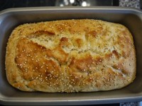 Mrs. Em’s Bread has a wonderful flavor. It’s quick and easy to whip up and the results were great. I will say that the inside of mine was slightly doughy even though by her guidelines it should have been done, but that could be partly due to my new loaf pan. Next time I’ll let it cook about 5 minutes more than she says.